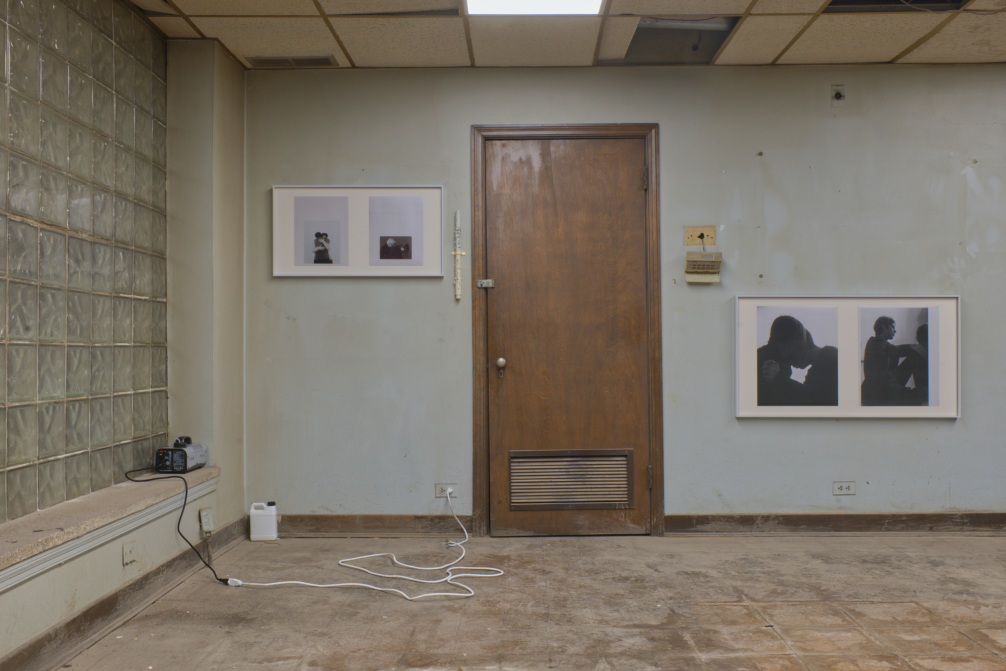 an infinite room, but still a room — photograph of choreographic work of the same name (performed by the artist), dissolved in liquid fog, Borgova 500W fog machine, broken clarinet parts, deconstructed floor lamp set to incremental timer, dimensions variable, 2025